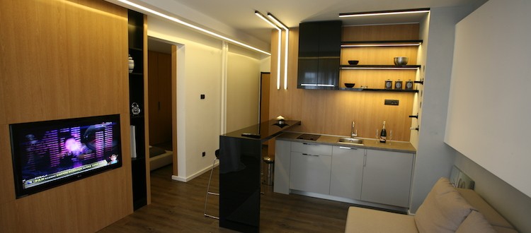 U funkcionalnom smislu prostor je podeljen na dnevnu zonu (koju čine predsoblje, čajna kuhnja sa pultom za obedovanje i dnevna soba) i studio za spavanje sa odvojenim kupatilom.