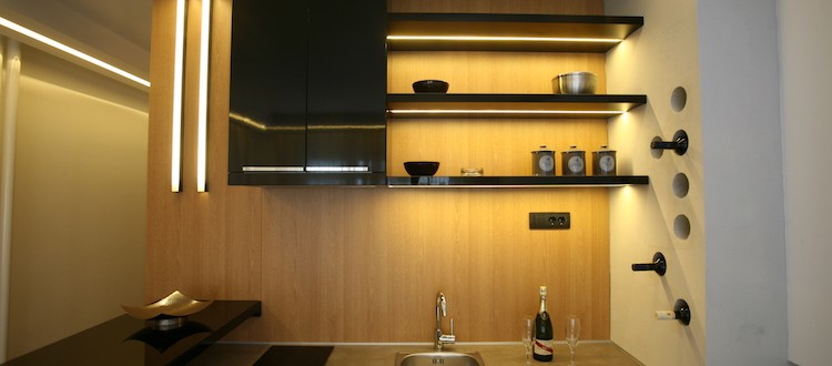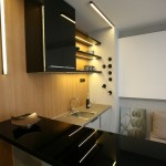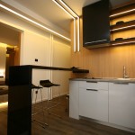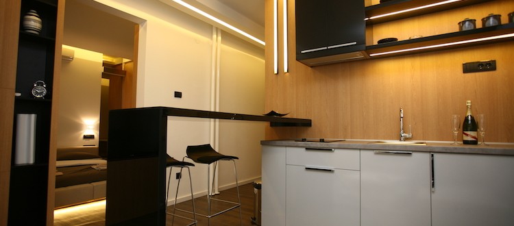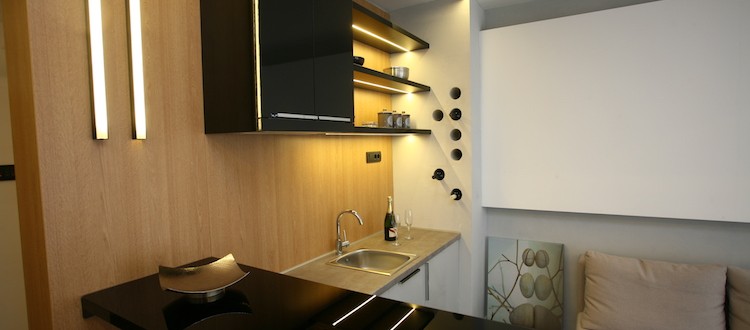 Kuhinja je minimalistička i opremljena osnovnim aparatima za pripremu toplih napitaka i jednostavnijih obroka (frižider, grejna ploča, sudopera) u sklopu koje se nalazi i pult za obedovanje.