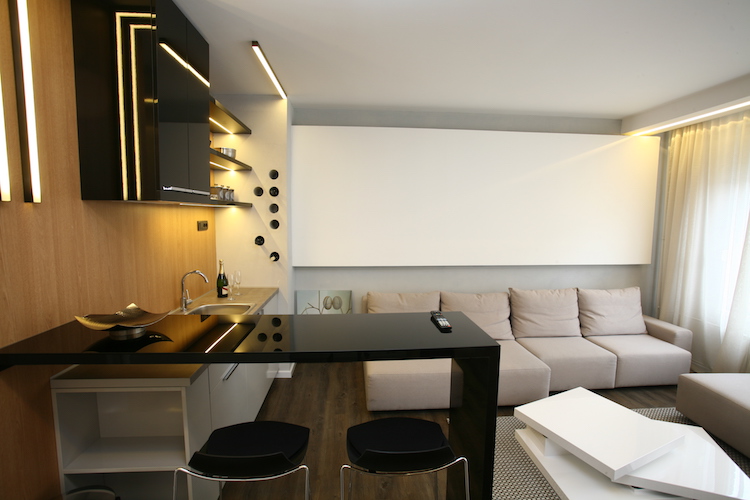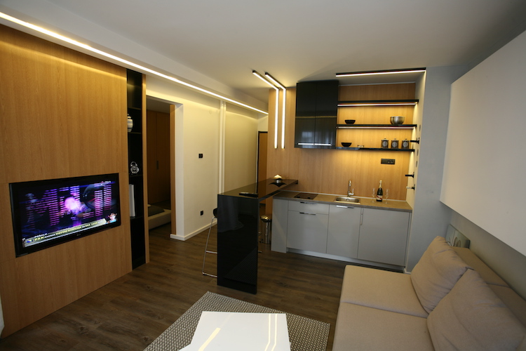 U funkcionalnom smislu prostor je podeljen na dnevnu zonu (koju čine predsoblje, čajna kuhnja sa pultom za obedovanje i dnevna soba) i studio za spavanje sa odvojenim kupatilom.