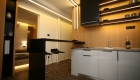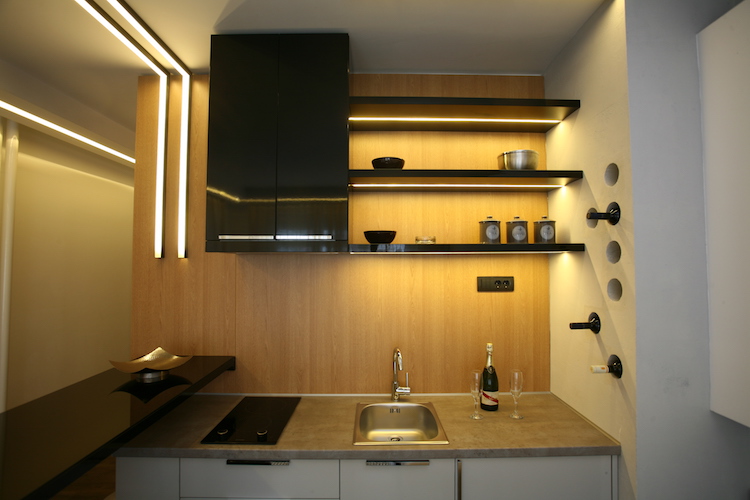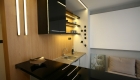 Kuhinja je minimalistička i opremljena osnovnim aparatima za pripremu toplih napitaka i jednostavnijih obroka (frižider, grejna ploča, sudopera) u sklopu koje se nalazi i pult za obedovanje.