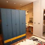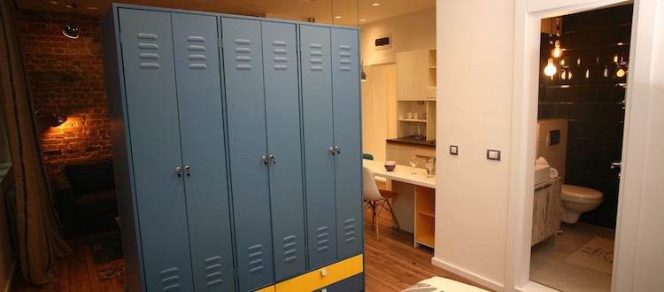 Kuriozitet ovog apartmana je svakako i namenski rađen plakar sa “dva lica” na sredini prostorije – sa jedne strane on je polica sa televizorom a sa druge, garderober urađen u stilu vojničkih kasetnih ormana.