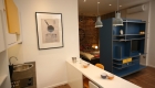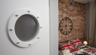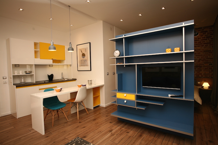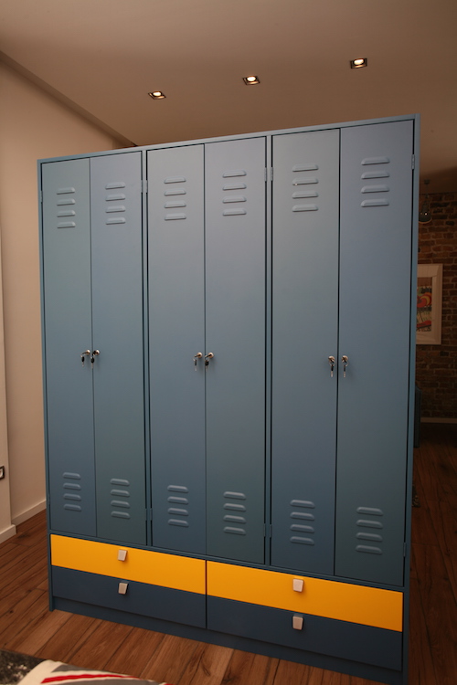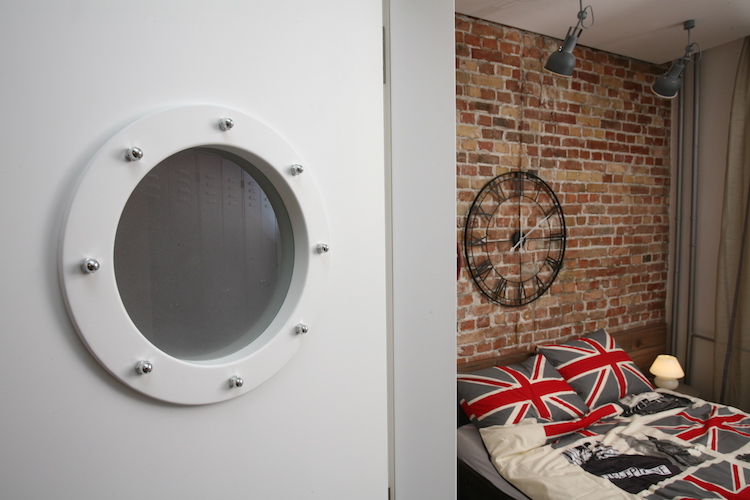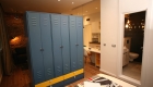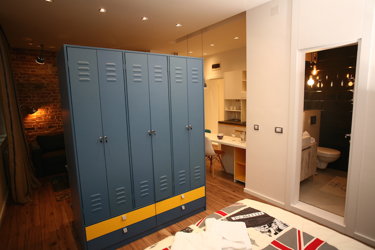 Kuriozitet ovog apartmana je svakako i namenski rađen plakar sa “dva lica” na sredini prostorije – sa jedne strane on je polica sa televizorom a sa druge, garderober urađen u stilu vojničkih kasetnih ormana.